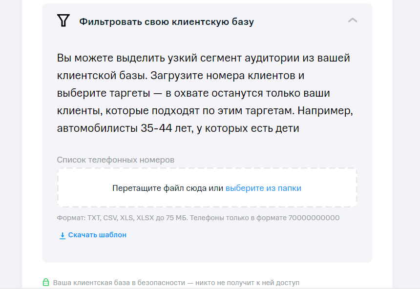 Таким образом можно сегментировать и фильтровать свою базу на основе данных, которые собрала Big Data. Загрузите все номера, выберите нужные таргеты, и система оставит только тех абонентов МТС, которые вам подходят. В отличие от предыдущей услуги, таргетированные SMS могут рассылать не только юрлица, но и ИП с физлицами.