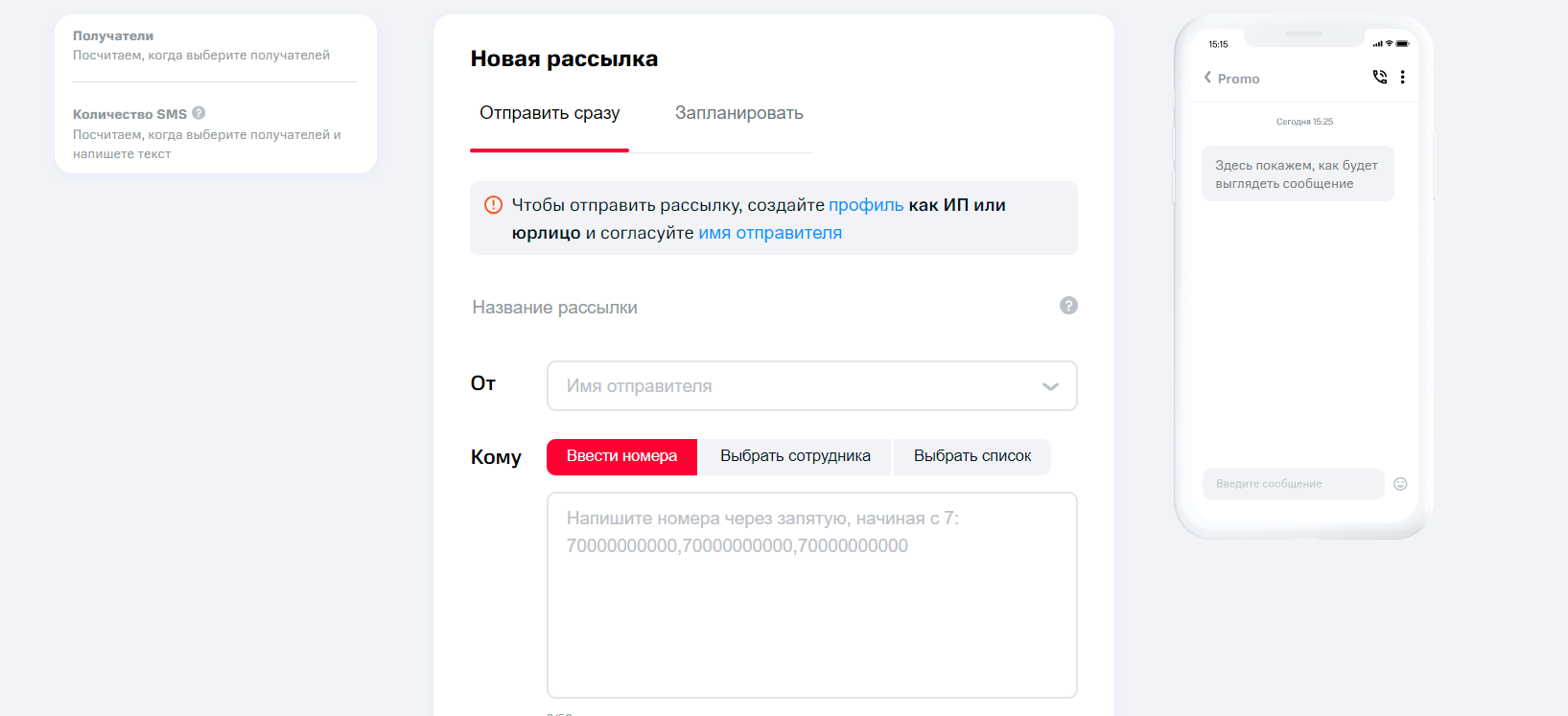Сервис подходит под задачи малого и среднего бизнеса. Чтобы начать отправлять сообщения по своей базе, вам нужно: