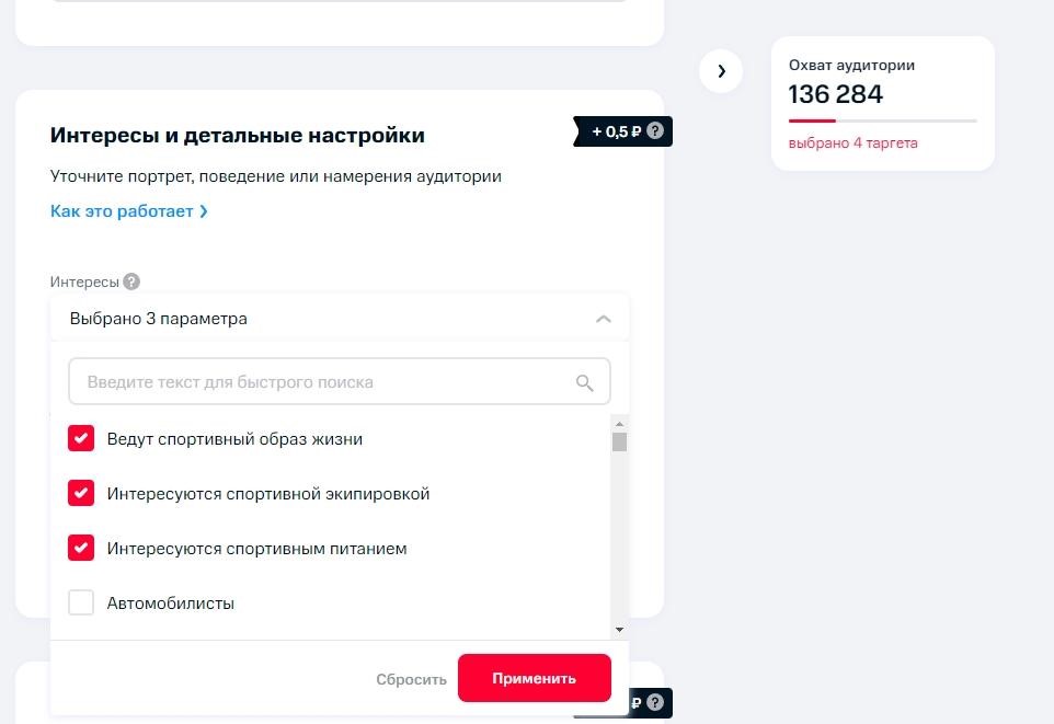 Так вы сможете запускать персонализированные рассылки, которые с большей вероятностью попадут в актуальные запросы аудитории. Например, магазин продаёт товары для спорта и здорового образа жизни. С помощью МТС Маркетолога можно подобрать сегменты потенциальных покупателей: