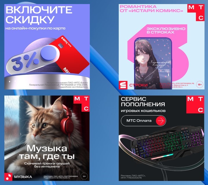 Центр креатива МТС Ads поможет с созданием креативов разных форматов — баннеры (в том числе 3D изображения), видео и GIF, реклама для Telegram Ads — на всех этапах, от идеи до производства.