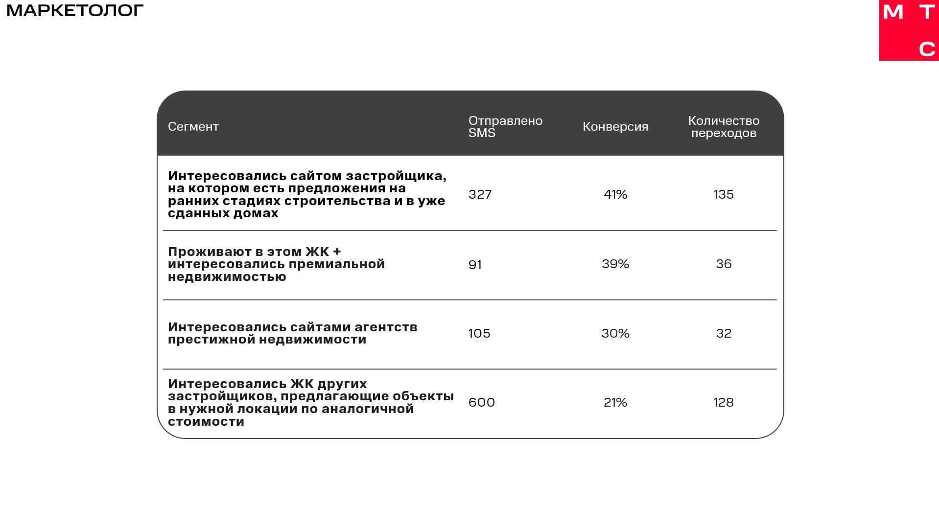 - Чтобы достучаться до клиентов, обходя всевозможные преграды, мы решили протестировать таргетированные рассылки в формате SMS и MMS, и получили отличные результаты. Конверсия из сообщения в переход на сайт достигала 41%. Мы отправляли сообщения потенциальным покупателям с помощью рекламной платформы МТС Маркетолог.