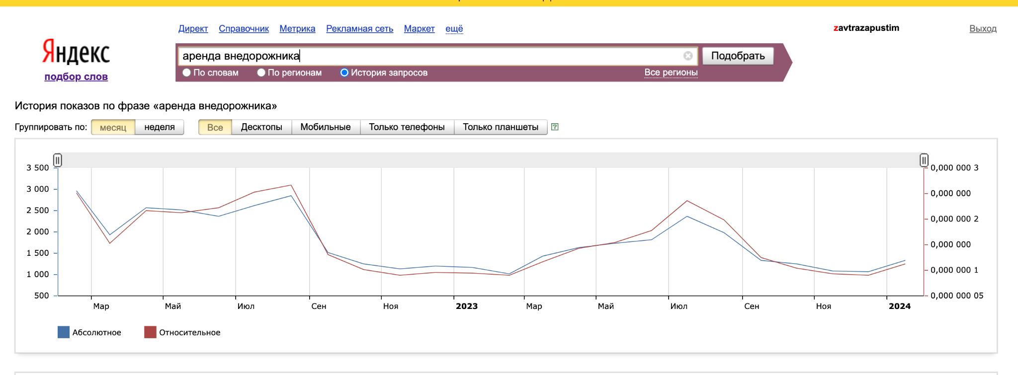 Есть ещё один момент. Важно зафиксировать не только текущее положение вещей, но и перспективу: рынок вашего продукта растёт или падает? Простой способ — зайдите на wordstat.yandex.ru — сервис, который показывает, сколько раз вбивали запрос за указанный период.