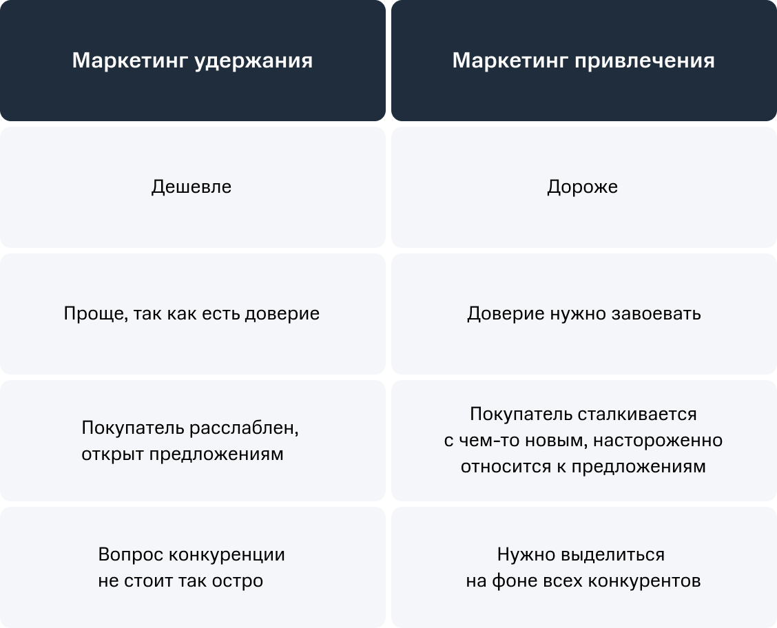 Обе эти сферы важны для бизнеса, поэтому обязательно направляйте свое внимание и ресурсы как на привлечение новых клиентов, так и на удержание старых. При этом есть несколько основных различий между этими типами маркетинга:
