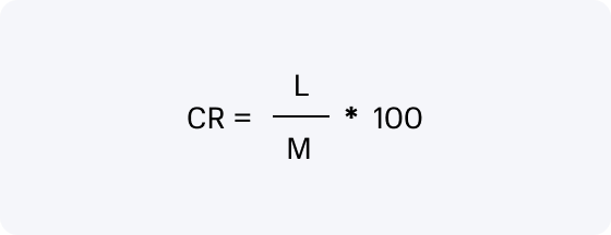 CR = количество клиентов на начало периода – количество клиентов на конец периода (L) деленное на количество клиентов на конец периода (M) и умноженное на 100%